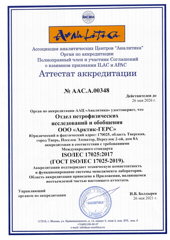 Аккредитация подтверждает техническую компетентность лаборатории и соответствие системы менеджмента требованиям международных стандартов. Полная область аккредитации (петрофизические испытания горных пород, определение пористости, проницаемости, прочности и др.) приведена в приложении.